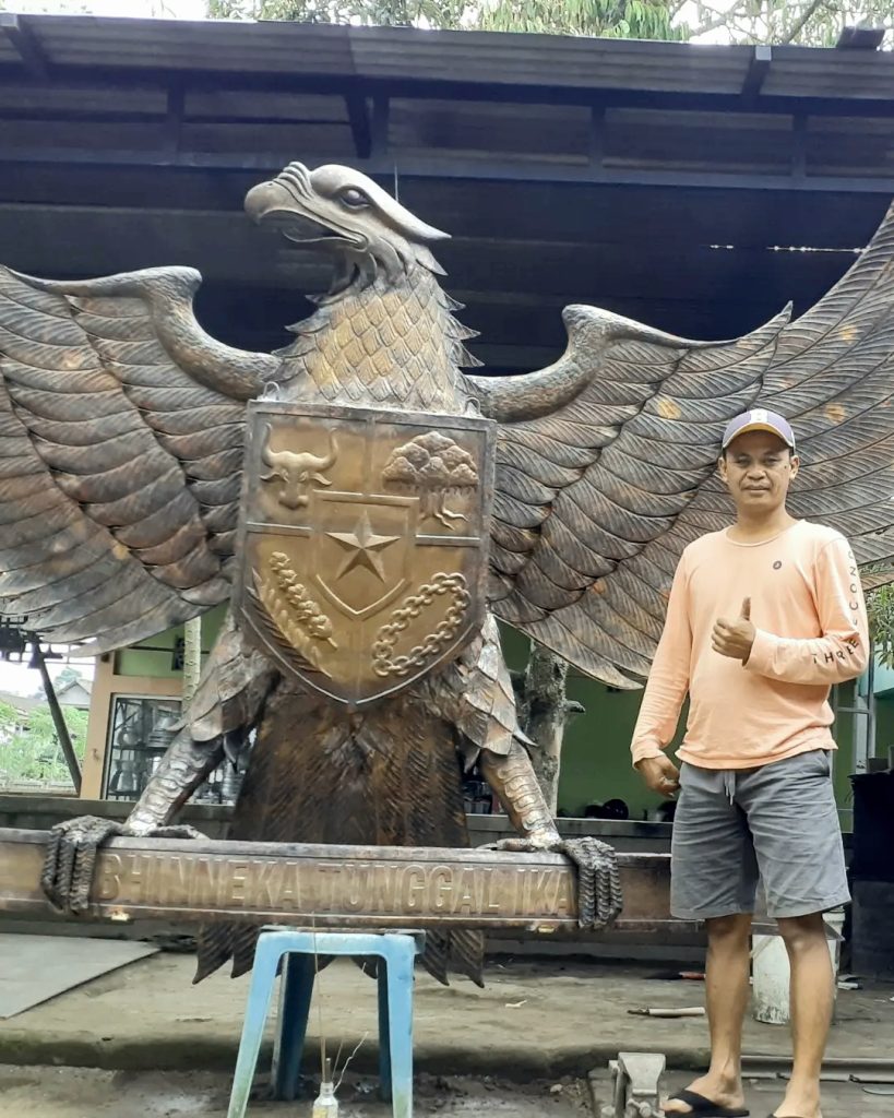 sedikit bercerita tentang cra pembutan burung garuda tersebut,dari kami orang orag desa yng mau beljar ,yang mau berinterksi sesama seniman seniman yang lebih pintar dan mahir di bidangnya.di desa kami yang centra industri di bidang logam terutama .dari nenk moyang yng sudah duluan membuat berkakas berkakas rumah tangga,yng sekarng bnyak yng berpengalan di jadikanya dri bhan tersebut ,enjadikan bnyak beragam seperti pembuatan garuda dari tembaga,ada lagi pembuat interior rumah dari tembaga ad lgi pembuatan exterior dari tembaga cara membuat barang menjadi sebuah lambang negara indonesia,atau garuda.pertama kali kamipekerja selau menananyakannya tentang gambar tersebut benarbenar sudah fixatau belum.agar nanti diwaktu pengerjaan tidak mengulagullang dari yng dia ,ingikn,kemudian langkah pertama ,menjadikan gambar tersebut menjadi 1×1 agr nanti bagi pemahat tidak gambar ulang 2 lagi ,kedua melukan pahatan dan dengan detail 1/1 sangat detail karna untuk lambang garuda tersebut bagi kami sngat sakral ,karena apa,dari syap,ekor itusemua terhitung dengan apa yng sudah tertulis dalm buku sejarah,indonesia,setelah itu kemudia melkukan upgread dri pahatan tersebut di jadika satu,sehingga ,membentuk sebuah burung garuda,sehabis di ragkai dan i jadikan satu kesatuan ,sampailah tahap finishing yang dinamakan di kami hitam doff piliha nowner ,yang nuansanya sangat kuat dengan burung aslinya itu sendiri,mnjadikan sangat sangat gagah,perlu di ketahui utuk ketahan finishing kami sngat lah lama.karna bnyak mngunakan bahan bahan yang mtrialnya super dan bagus.ketebalan dari clear tersebut berlapis lapis lapis,
